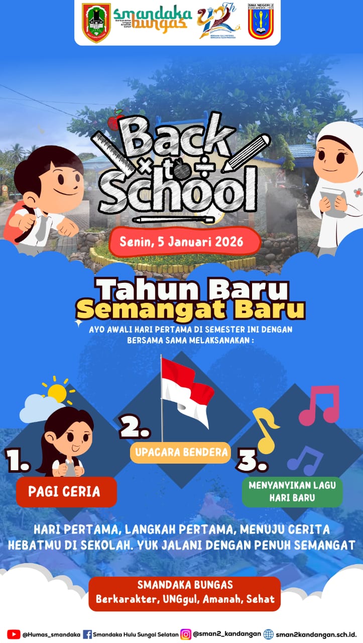 SMAN 2 Kandangan mengawali kegiatan dengan penuh semangat melalui rangkaian kegiatan Senam Anak Indonesia Sehat, dilanjutkan Upacara Bendera, do’a bersama untuk kelancaran proses pembelajaran semester genap, dan ditutup dengan menyanyikan lagu “Hari Baru”.